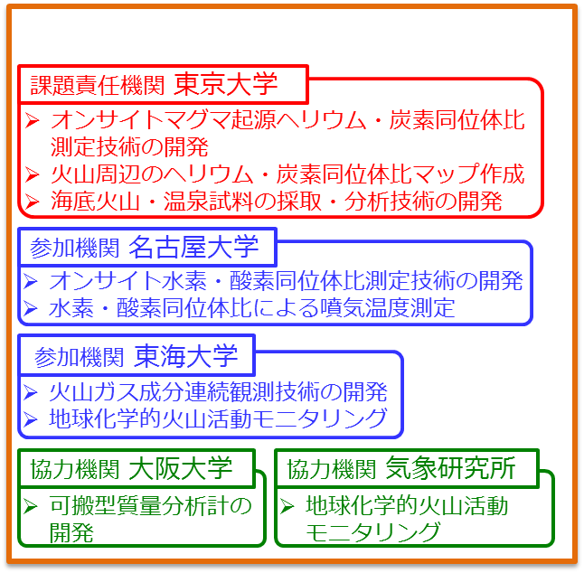 - 噴煙中の水蒸気等の水素・酸素同位体比のオンサイト分析による、噴気温度測定や噴火タイプ(水蒸気爆発/マグマ爆発)判別。